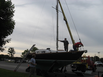 At the launch site a crane raised the mast. Happily, the new rigging fit just fine.
