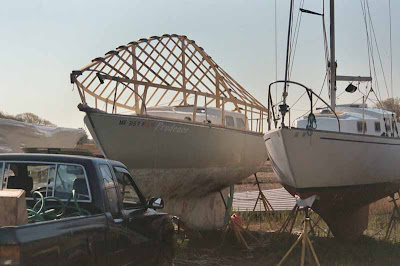 Nothing too fancy this year. Last year I spent more time building a winter cover than I spent actually working on the boat so this year I went with a simple ridgepole and tarp. I can open the tarp if I want to but I don't plan on working inside of the boat much this winter. I did all the usual winterization stuff - nothing worth noting there. I re-used the framework around the bottom of the boat to secure the tarp to. I did not realize at the time that without the bow frames tying the bottom framework and the ridgepole that there was nothing to keep the bottom framework from being pulled up by the tarp. I have one 2x4 that goes under the keel and holds the framework down but the ends still want to fly up. My solution was to take the re-bar that kept the bottom frame in position last year and bend the ends over like candy canes and drive them in over the top of the frame.